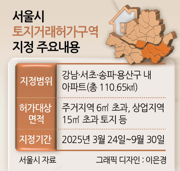 2025년 3월 24일부터 서울시의 강남 3구(강남·서초·송파구)와 용산구의 모든 아파트가 토지거래허가구역으로 재지정되었습니다. 이는 최근 부동산 시장의 과열을 억제하고, 투기적 거래를 방지하기 위한 조치로 해석됩니다.MBC NEWS